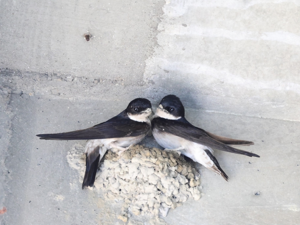 1羽が巣材の土を運び、2羽で協力して新居を作っていました。