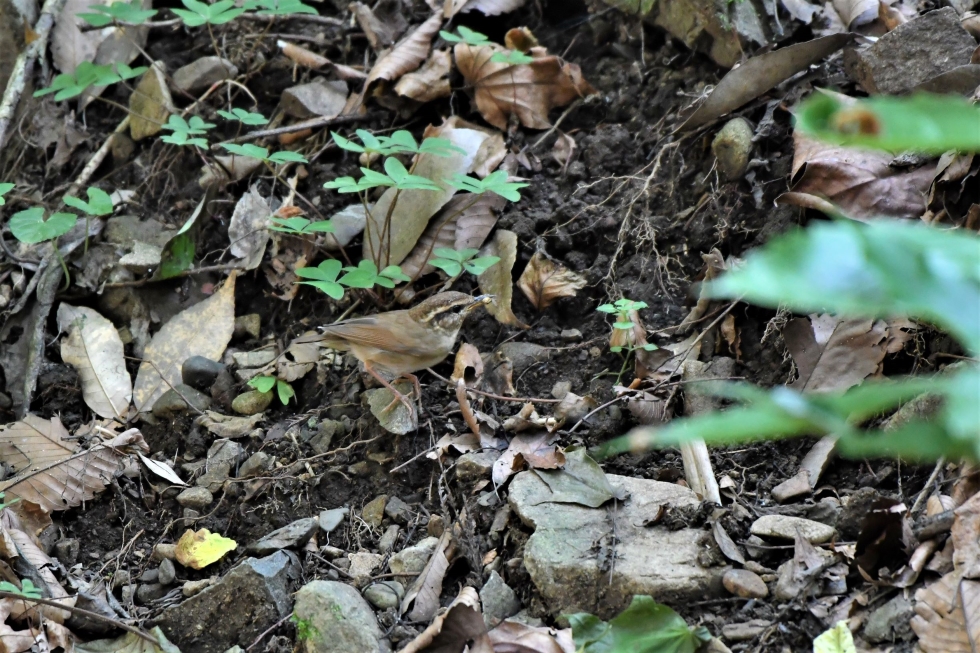薄暗い場所が好きで小さくて素早く動き、地味な羽色のヤブサメが、体色に似ている落葉の上で採食しています。数メートルの近さでも見つけるのが大変です。風に揺れる落葉に見えます。