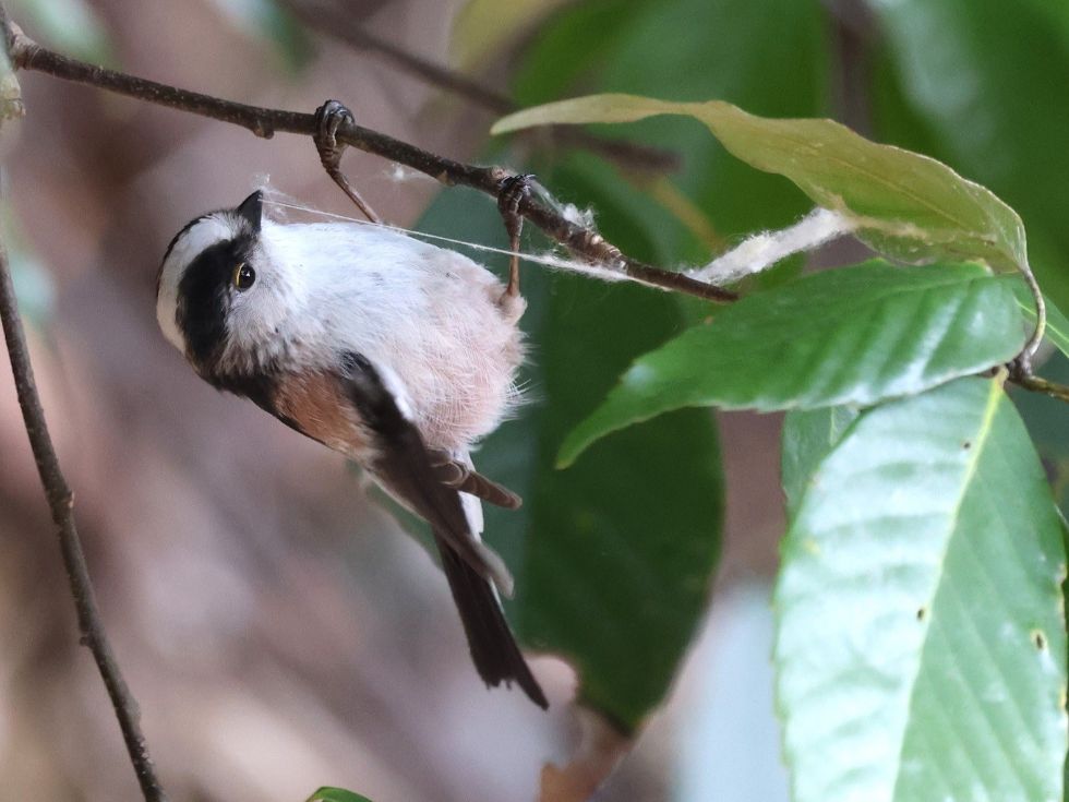 エナガが真綿のような巣材(クモの糸か、何かの繭でしょうか?)を苦労してはぎ取っていました。
