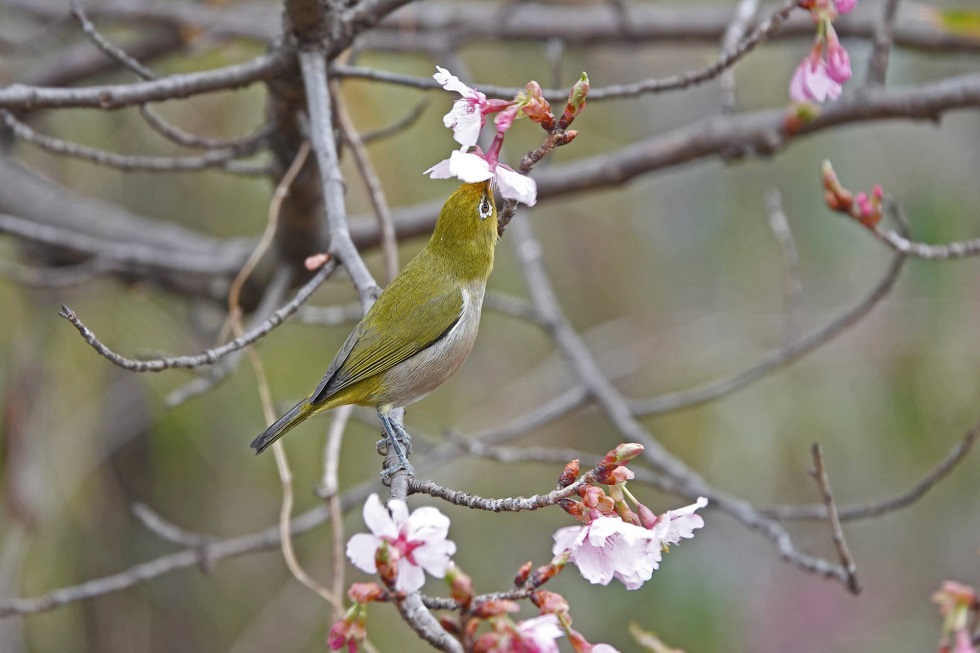 陵北大橋下流の河原の早咲きの桜の花にメジロが吸蜜に来ていた