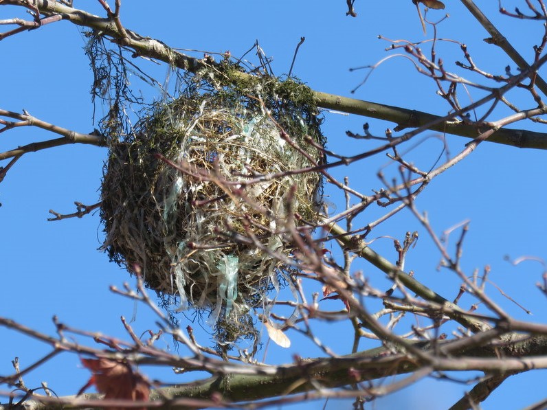 | 高尾山山頂のメジロの巣 高尾山山頂の葉を落としたカエデの枝にメジロのものと思われる古巣があった。巣の直ぐ下に山頂の標識があり、恐らく数万の人が巣の直下を歩いたものと思われる。 メジロはツバメのようにカラスなどの天敵から巣を守るために人の多く集まる所を選んだものと思われる。巣材にビニール紐のような新建材が使われていた。 撮影場所:高尾山山頂 撮影日:2017.12.6 撮影者:粕谷和夫 |