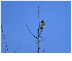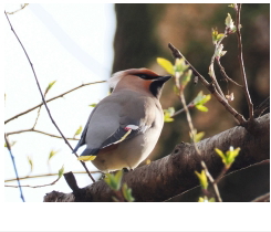 解説:冬鳥であるが、当地では3月の観察記録が最も多い。同じ仲間のヒレンジャクの群れに入って、ヤドリギやヤブランの実を食べている様子を見ることが多い。ずんぐりとしたシルエットで、尾羽の先は黄色、特徴的な冠羽がある。