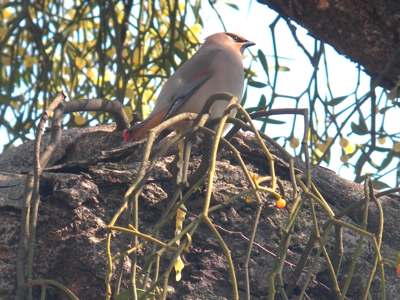 ヒレンジャクは、ヤドリギの実を食べて粘着性のある長い糞をするが、これがヤドリギの散布になる