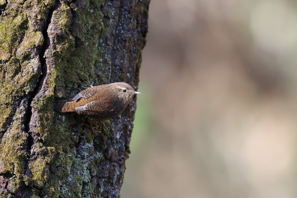 春のさえずり時期ではない冬期に木道の下を素早く6〜7メートル移動して離れた場所に姿を見せる忍者のようなミソサザイの姿をとらえました。