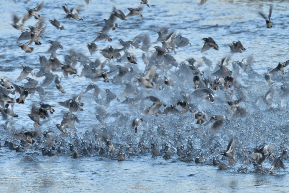 大集団(500羽くらい)の水浴びで水煙が立つほどです。皆、一風呂浴びてねぐらへ帰ります。