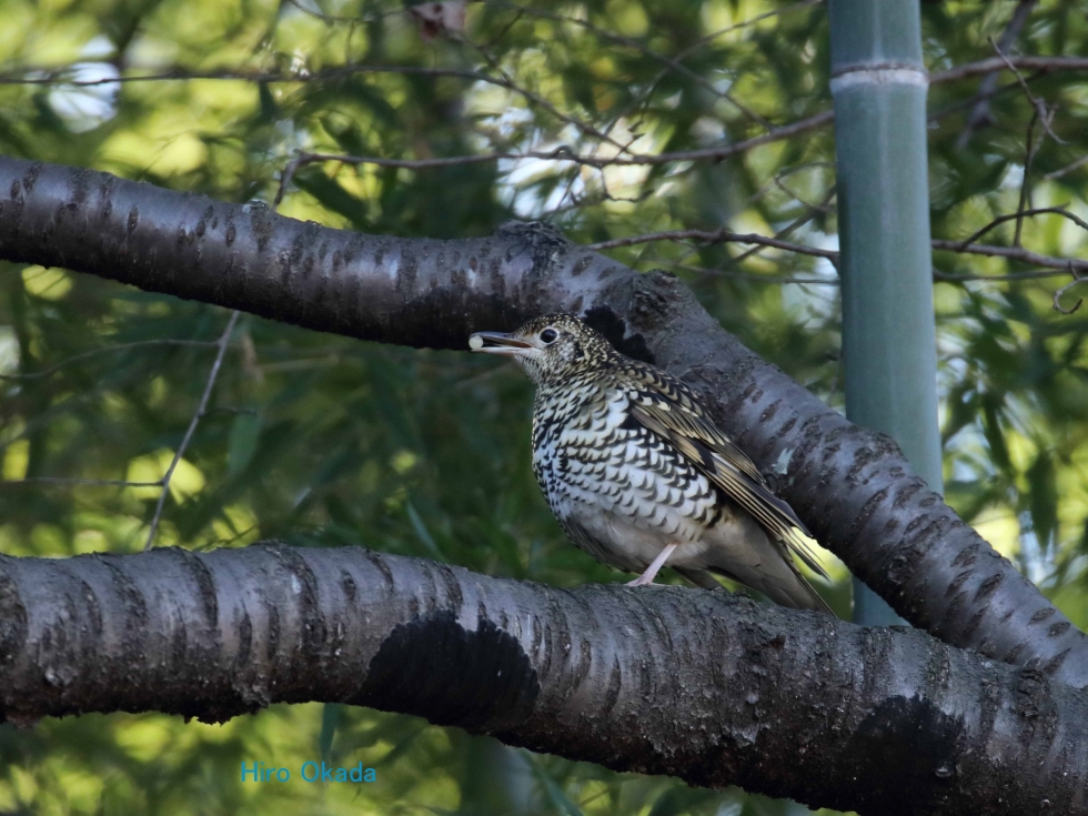当初は地面で餌を探していて、青い実を食べた。そうこうするうちに猫が近づいてきて、トラツグミは樹上に逃れた。 しばらくして、トラツグミは白い実を吐き出した。写真は実をくわえたところではなく、クチバシに戻したところ。
