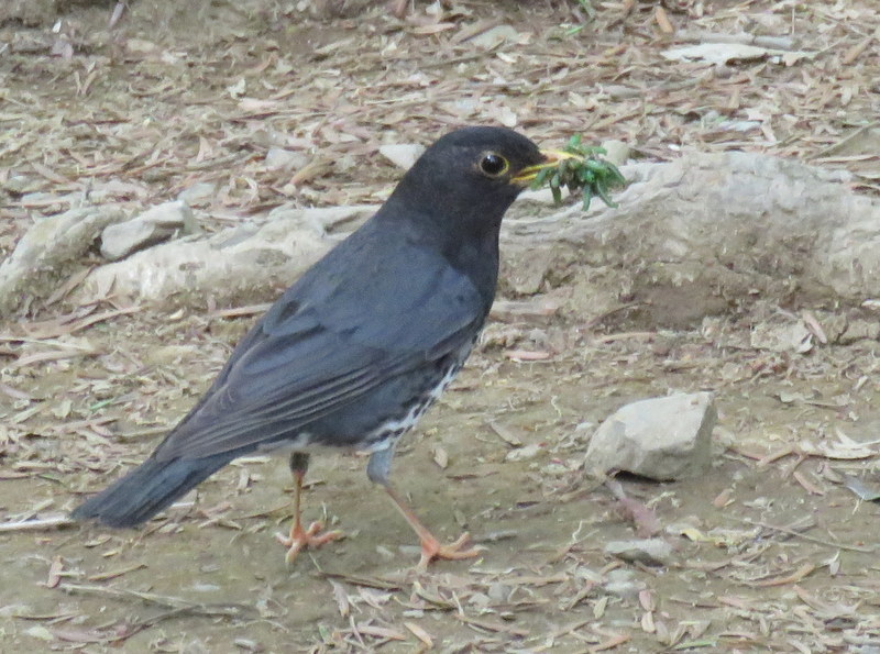 3号路かしき谷園地のベンチで昼飯を食べていると、直ぐ近くにクロツグミのオスがやって来た。観察していると、餌を口一杯にくわえて飛び去っていった。
