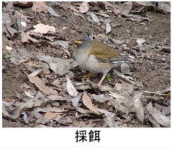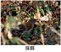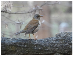 解説:冬鳥として当地に渡来する。丘陵地の公園などで枯葉をひっくり返し、餌を探している姿をよく見かける。明るく開けたところにはあまり出てこない。概ね11月から翌年4月頃まで当地に滞在する。アカハラと似るが、名前のとおり体下面は白っぽく見える。雌雄ほぼ同色であるが、メスは全体にオスよりやや淡色気味。