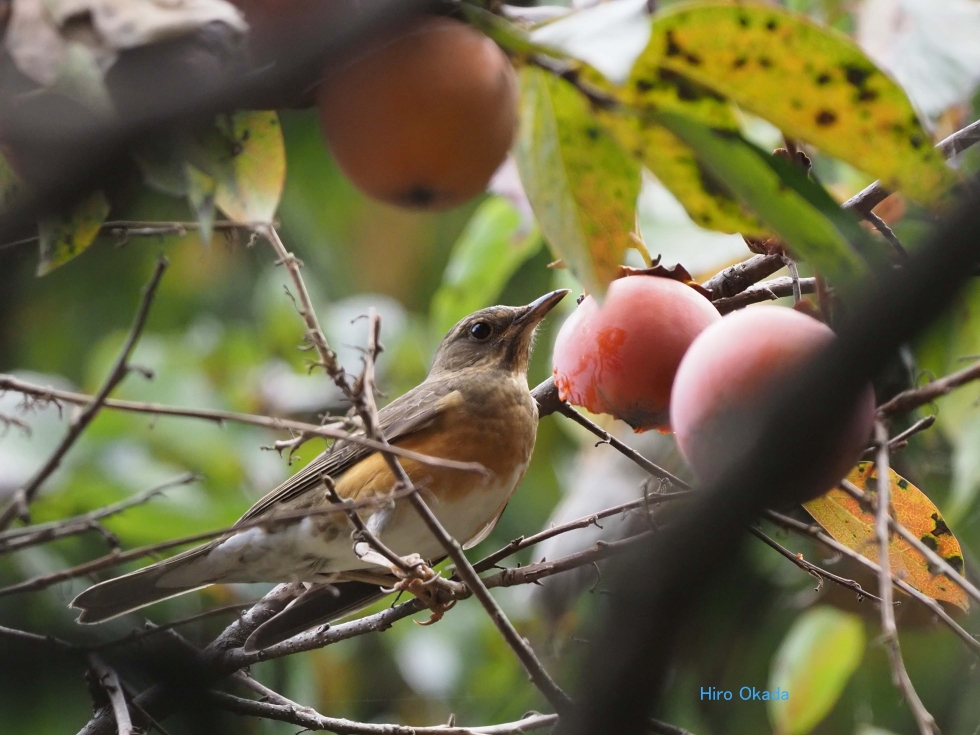 :アカハラがカキの実をつついていた。アカハラは今季初めて見かけた。