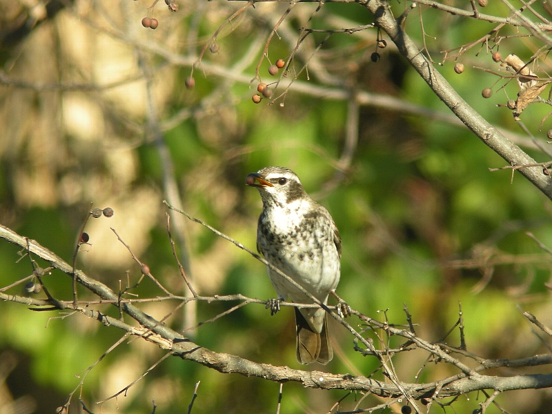 木の実を食べるツグミ。この個体は胸の模様が帯状になっている。