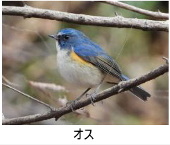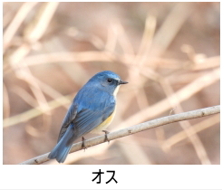 解説:当地には冬鳥として姿を見せる。丘陵地の小宮公園などでは、11月頃から見られるようになる。名前の通り、オスは頭から背、尾にかけて青い色をしているが、メスは体上面は薄褐色で尾羽のみ青い。雌雄とも下面は白く、脇は橙黄色である。オス若鳥もメスと同じような色合いで区別がつきにくいが、オス若鳥は翼角のあたりがわずかに青みがかっている。