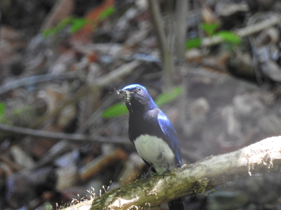 ミズキの葉を食べ尽くした大量のキアシドクガが蛹になるために地上に降りて来ていた。オオルリがミズキの木に飛び込んだ。次の瞬間地上近くの枝に降りた。そのオオルリがキアシドクガの幼虫を口に咥えていた。