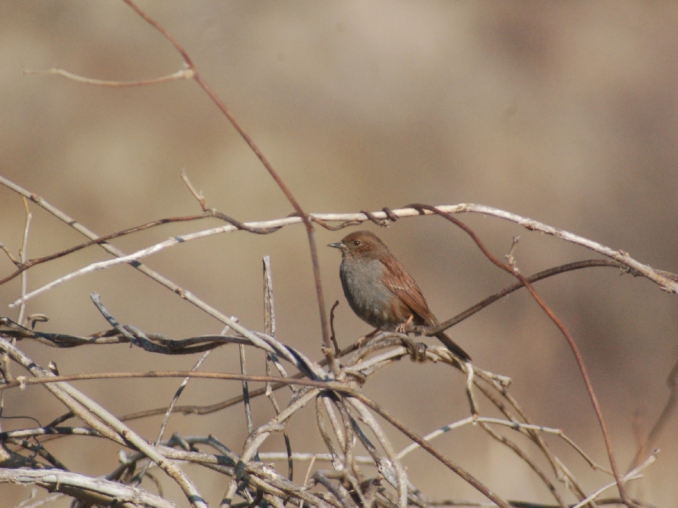 クロジを双眼鏡で見ていたらカヤクグリが入ってきた。カヤクグリはしばらくブッシュの木のテッペンにいた。