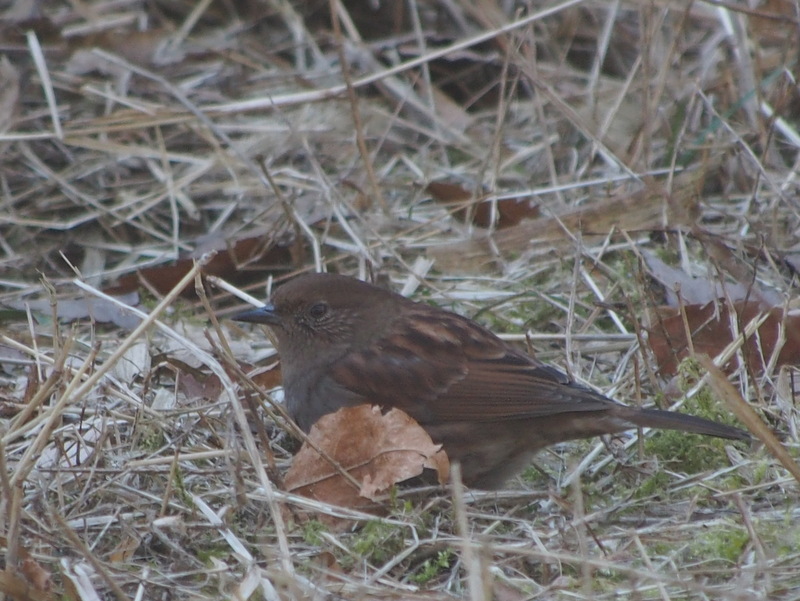 小仏川沿いの道を歩いていると蛇滝橋の手前の草地でカヤクグリ2羽が採餌していた。