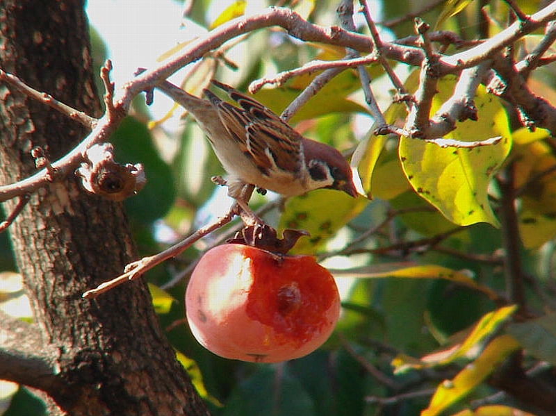 数羽が熟した柿の実を食べていました。