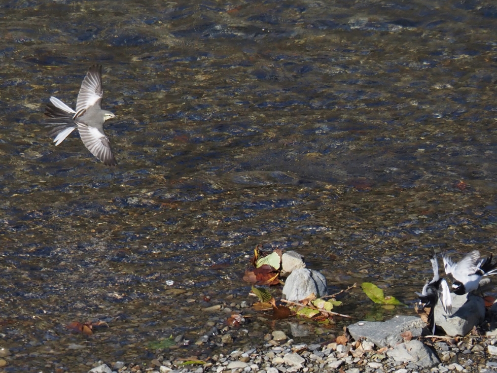 セグロセキレイ同士の喧嘩を眺めながら飛ぶハクセキレイの広がった羽の美しさを初めてとらえることができました.