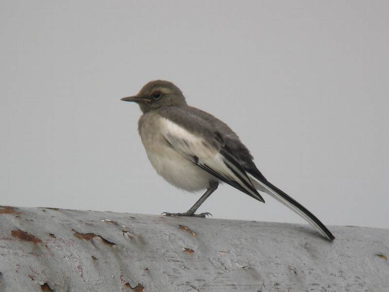 橋の鉄管の上に乗ったセグロセキレイ幼鳥。まだ嘴に黄色味が残る。