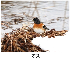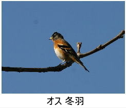 解説:冬鳥として、当地の山地や平地の林に渡来する。年によって渡来数は大きく変動し、ほとんど見られない年もある。高尾山で1000羽をこえる群れが観察されたこともある。当地では、11月から翌年3月くらいまでの観察記録が多い。雌雄ともに胸から脇にかけての橙色が目立つ。オスの頭部は春先になると黒味がかってくる。
