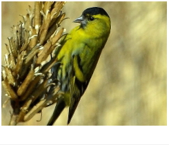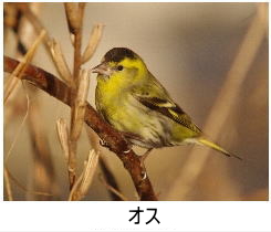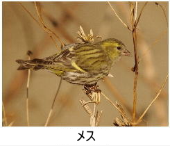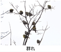解説:当地では、冬の黄色い鳥の代表格である。11月後半から翌年4月にかけて観察記録がある。山地や平地の林、河原などで見られるが、年によって当たり外れがあり、観察数は大きく異なる。草木の小さな種子を好み、群れで採食する。 大きな群れでは数百羽にも達する場合がある。