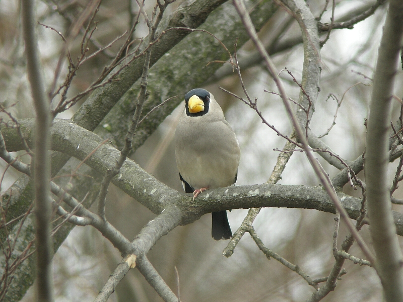 正面から見たイカル。 大きな嘴が顔の半分位を占めている。