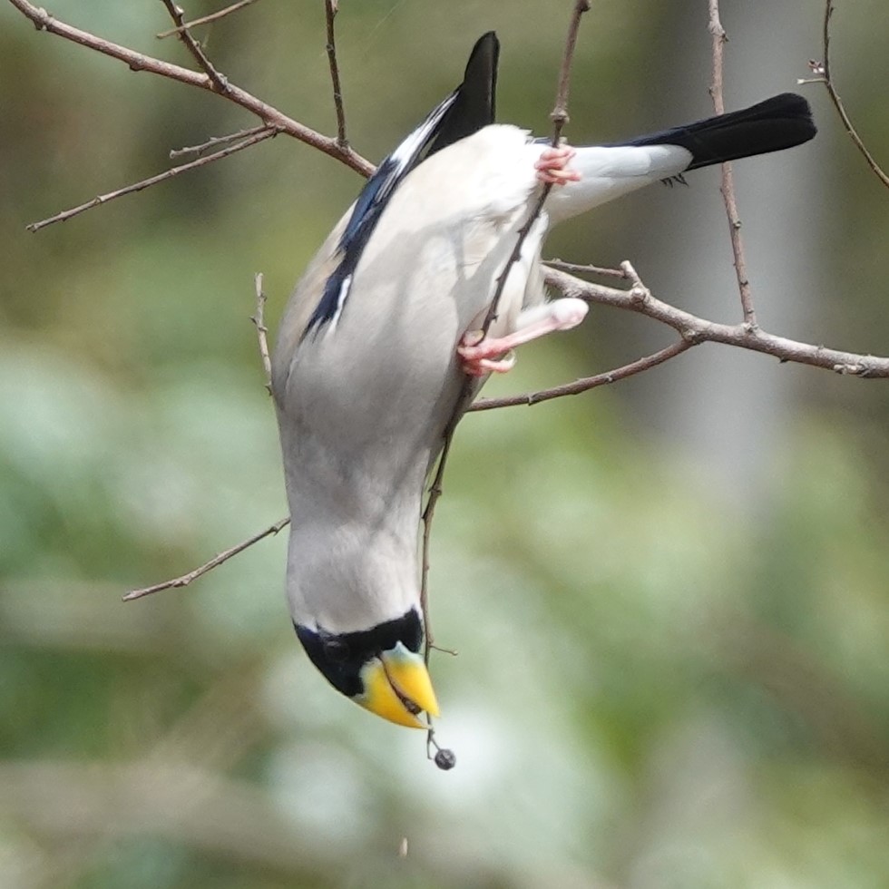 イカル2羽がエノキの細い枝に止まり逆立ちするような姿勢になり実を食べていた。