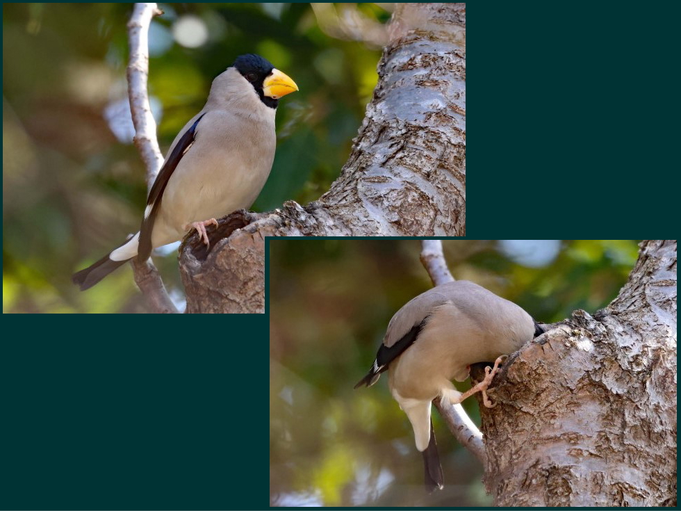 近くでイカルが鳴いているなあと見上げると、イカルが木のくぼみに溜まった水を飲んでいた。