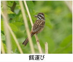 解説:当地では、山地の林縁部や河原等で一年中見られる。漢字では「頬白」である。字のとおりオス、メスとも頬が白い。オスの過眼線は黒く太いが、メスは茶色で体色も全体にオスより淡い。繁殖期には、オスが背の高い草の上や樹上の目立つ所でさえずっている姿をよく目にする。秋にもさえずることがある。さえずりの聞きなしは「源平ツツジ白ツツジ」、「一筆啓上仕り候」、「札幌ラーメン味噌ラーメン」など多くある。地鳴きは「チチッ」と2声もしくは3声で鳴く。アオジは「ヂッ」と1声なので区別がつく。