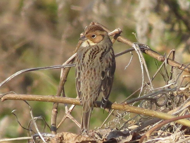 定期カウントで観察。暁水管橋より上流の右岸排水路付近で、ホオジロと一緒に行動していた。お腹はよくみせてもらえなかったのですが、脇の縦斑やお腹の色などがオオジュリンのような感じでした。