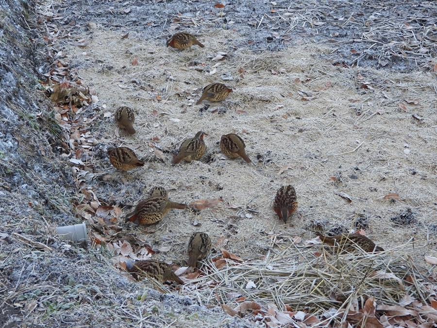 寒い朝、霜の降りた田んぼでコジュケイが群れで餌を食べていました。長池公園で見た群れとしては最多です。