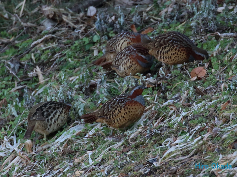 総勢7羽で地面をつついた跡を、アオジ2羽が追いかけるように地面をつついていた。
