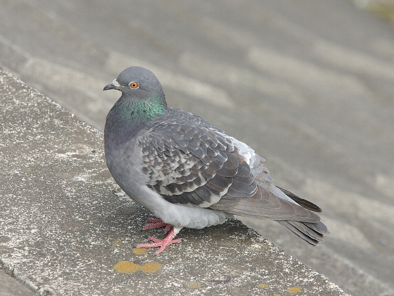 最も普通にいるタイプのカワラバト(ドバト)。個体変異は多いが、赤い足、オレンジ色の虹彩、鼻の部分の鼻瘤は共通である。