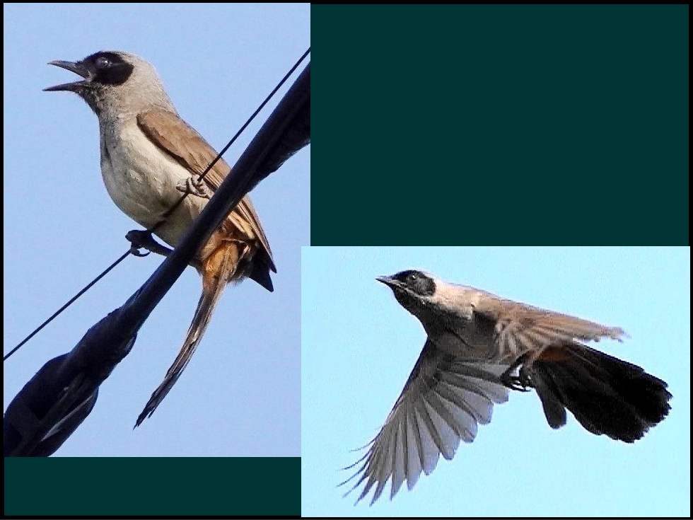 裏庭辺りでヒューヒューと聞きなれない鳥の鳴き声がうるさかった。確かめるため外へでたら頭上の電線にカオグロガビチョウが飛んできた。移動したと思ったらもう1羽飛んできて目の前に止まり、鳴き続けていた。家々の庭や電線を移動して神社の方に飛んで行った。
