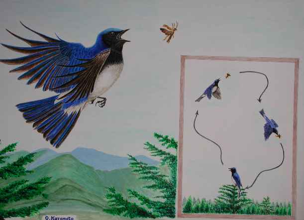 カ:へー、面白そうだね、だけど、口で説明を聞いただけじゃ よくわからないから 虫をとるところを一度やってみせてくれない? オ:やってもいいけど いつも成功するわけではないんだ。虫のほうも捕まえられないように必死で逃げてしまうんだ。 カ:そうでしょうね。 オ:よし! 今だ!(オオルリが見事に虫をつかまえた) カ:サッスガだ お見事! お見事!!
