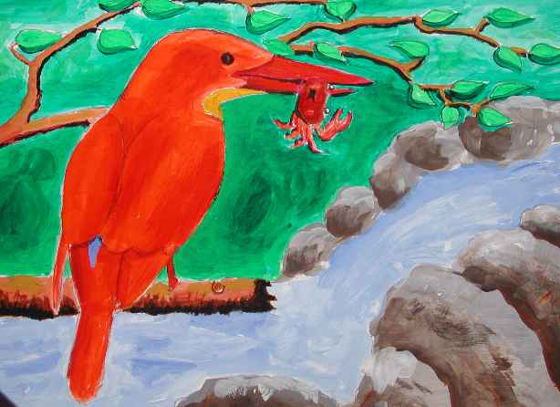カ:アカショウビンさんは、オオルリ君と同じように川の上流というか、源流といわれているところで暮しているのよ。アカショウビンさんは、サワガニが好きなんだって。アカショウビンさんは、全身真っ赤なとても綺麗な鳥なのよ。
