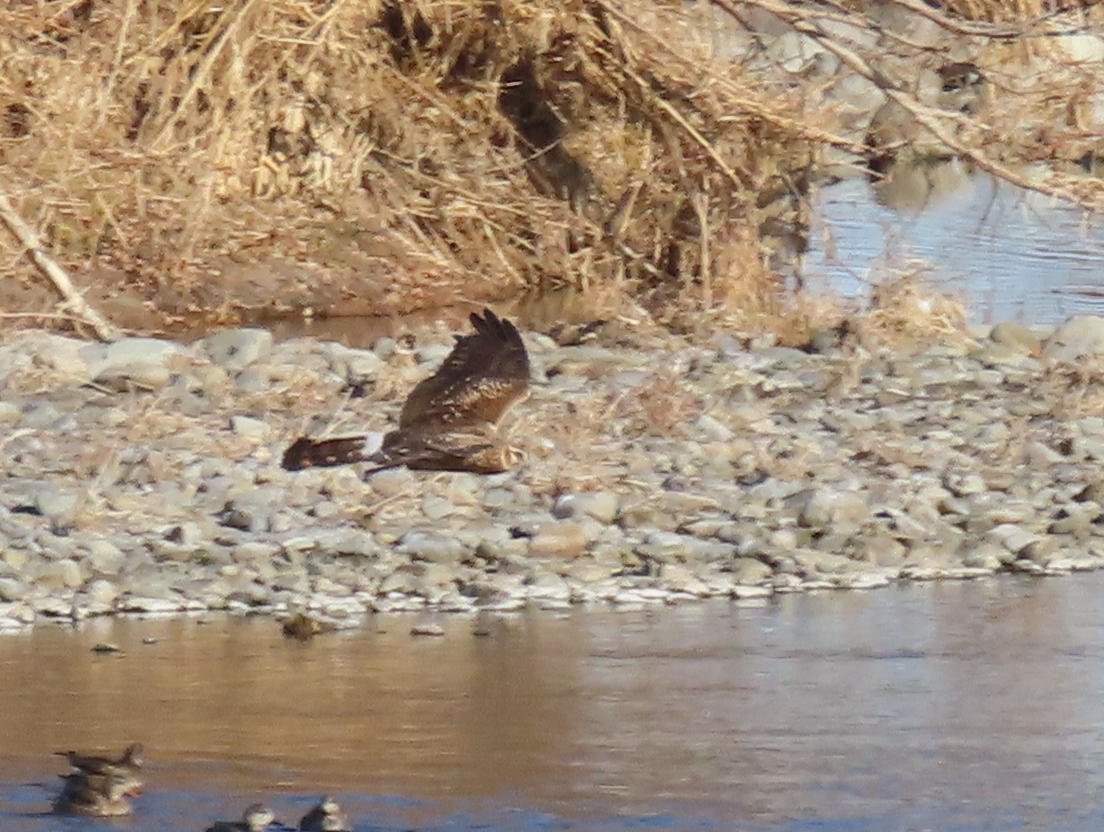 タイトル: 観察年月日:2024年12月29日 羽数:1羽 場所:多摩川 JR鉄橋100M上流付近 区分:猛禽 メッシュ:立川1B コメント:水面のカモを見ていると見慣れない猛禽が川面を低く横切り左岸の林へ飛んで見えなくなりました 暫くして又現れると下流方向へ飛びJR 鉄橋手前の右岸土手付近で見失いました 認定委員の古山様より腰の白さや風切り羽の横斑、顔つき等からハイイロチュウヒで雌雄や年齢は判別不明と認定して頂きました 翌日も近くの会員の方などに数回観察されたようです 地元で観ることが出来て嬉しい見納めとなりました