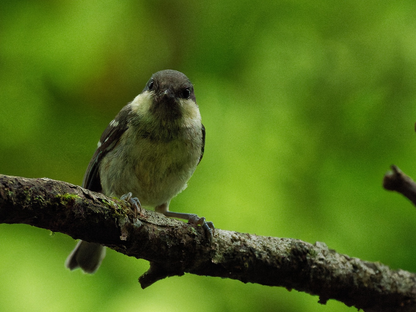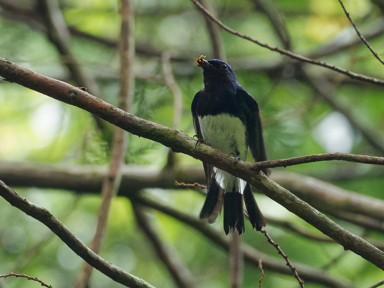 タイトル:近くに巣立ち雛か 観察年月日:2025年7月5日 羽数:1羽以上 場所:醍醐林道ににく沢出合より上流 区分:繁殖 メッシュ:五日市4A コメント:ににく沢出合上流の川から林道が少しづつ離れる最初のヘアピンカーブ先の杉林で、いきなり目の高さの枝に突然飛んで来た雄に目をやると沢山の虫(羽蟻?)を咥えているので直ぐカメラを向ける。すると雛の呼び鳴きと警戒鳴きを始めたので状況を察して直ぐに現場を後にした。近くに巣立雛が居たのは間違いないと思われる。写真は警戒鳴きを始めたその瞬間。
