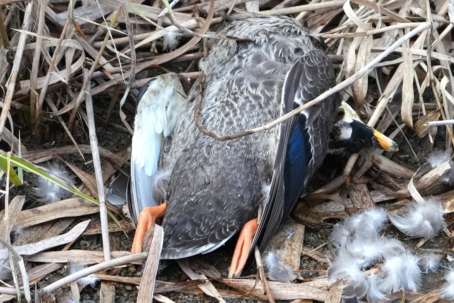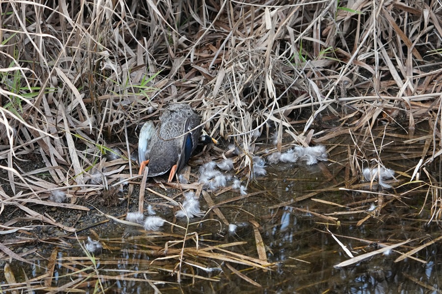 タイトル:犠牲者はカルガモ 観察年月日:2025年12月22日 羽数:1羽 場所:城山川・五反田橋上流側 区分:食痕 メッシュ:八王子4K コメント:日の出時刻頃に城山川沿いを散歩していると薄暗い川辺に白い物がパラパラと見えたので不思議に思い保護柵から身を乗り出して川の中を覗き込むと突然大きな鳥が飛び立った。 大きさから猛禽かなと思ったが、暗くて鳥種も何が犠牲になったかも確認できなかったので、明るくなってから確認に行ったら白い物は「抜け落ちた羽」で犠牲者はカルガモだった。