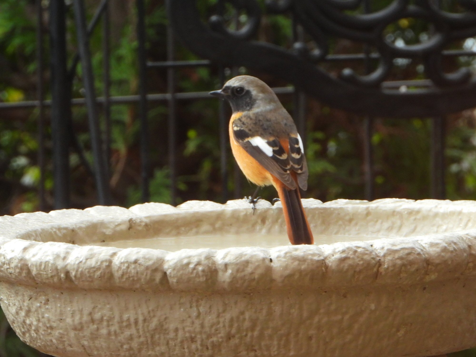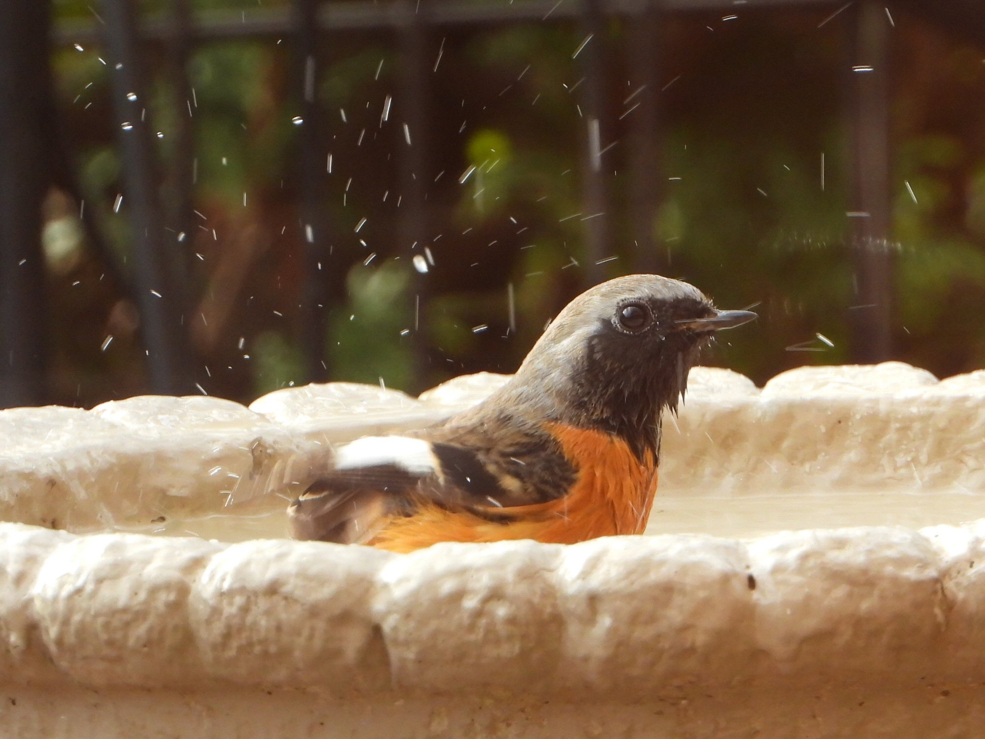 コメント:先客のメジロやスズメを追い払って朝風呂を満喫していた。昨季はジョウビタキ・メスが自宅マンションの中庭を縄張りにしていたが、今季はオスがここで越冬してくれると楽しみが増える。