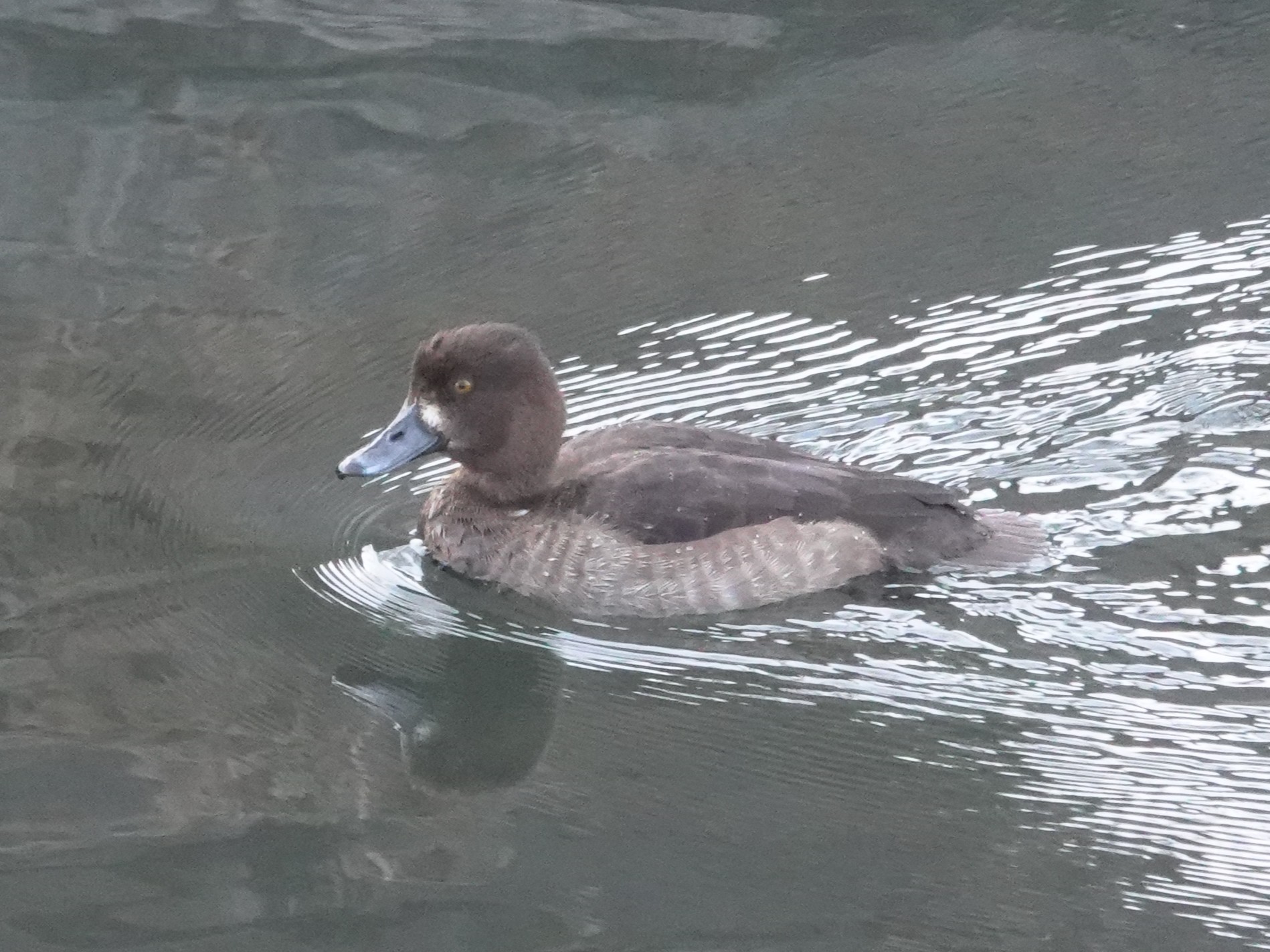 コメント:今季初認。大栗川では珍しい。時々潜水を繰り返していた。スズガモと紛らわしいが、念のため識者に確認いただいた。