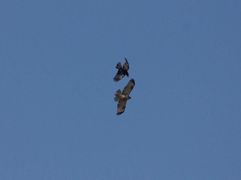 ハシボソガラスにしつこくモビングされるノスリ。 大きさの違いがよくわかる。