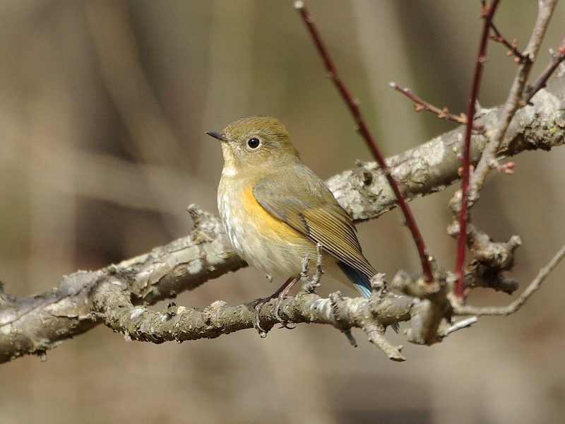 梅の枝にとまったルリビタキ(メス型)。冬には平地の公園で見られる。肩のあたりが少し青い感じがするので、オス若鳥か?