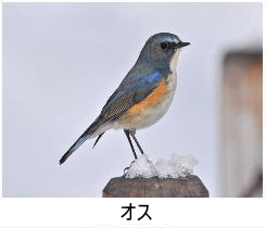 解説:当地には冬鳥として姿を見せる。丘陵地の小宮公園などでは、11月頃から見られるようになる。名前の通り、オスは頭から背、尾にかけて青い色をしているが、メスは体上面は薄褐色で尾羽のみ青い。雌雄とも下面は白く、脇は橙黄色である。オス若鳥もメスと同じような色合いで区別がつきにくいが、オス若鳥は翼角のあたりがわずかに青みがかっている。