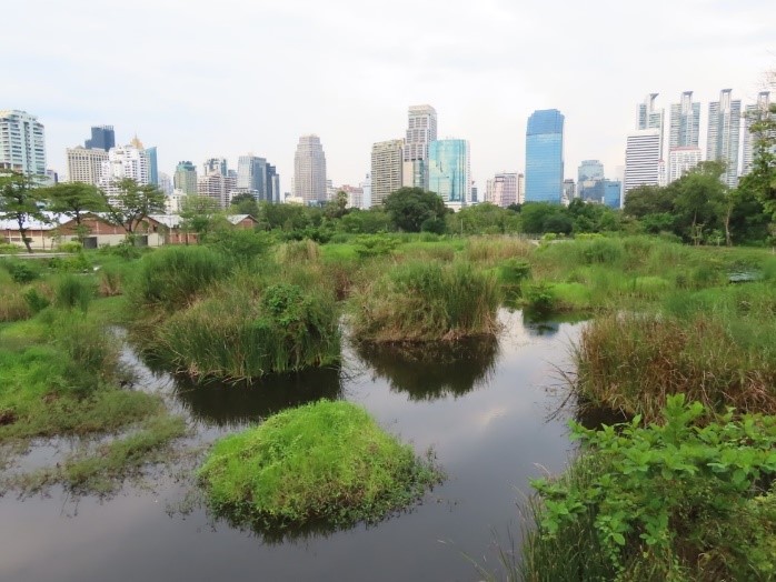 この2つの公園は都心の南寄りにあって、ほぼ繋がっていますので併せてご紹介します。ベンチャキティ公園はBTSスカイトレインのアソーク駅または地下鉄MRTのクイーンシリキット国際会議場から徒歩数分〜10分程度、ルンピニー公園はBTSのサラデーン駅またはMRTのシーロム駅から徒歩数分と、いずれも利便なところにあって都民の憩いの場となっています。ルンピニー公園は水辺も豊富な日比谷公園といった趣の人工的な都市公園で、観光客が「ワニがいる!」といって騒ぎになる、実はおとなしいミズオオトカゲが生息しています。ベンチャキティ公園はタバコ公社の跡地を利用して、この地に本来あったと考えられる湿性環境を復活させ、そこを高架歩道で散策できるようにした公園で、ルンピニー公園とは好対照ですが、市内では一番にお勧めの公園となります。