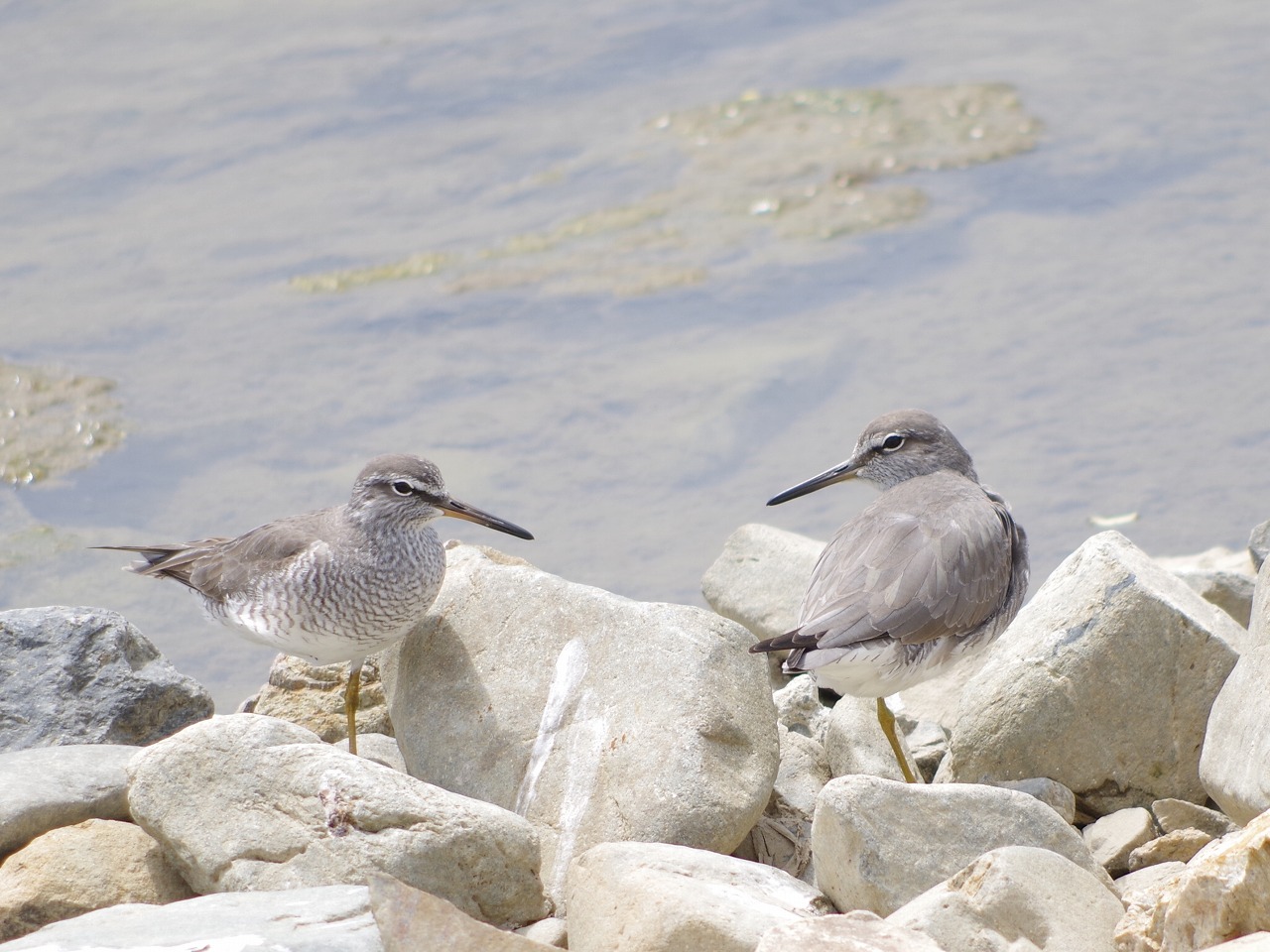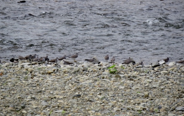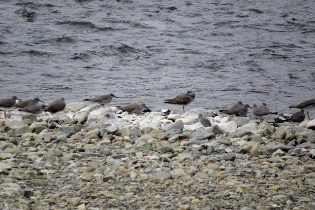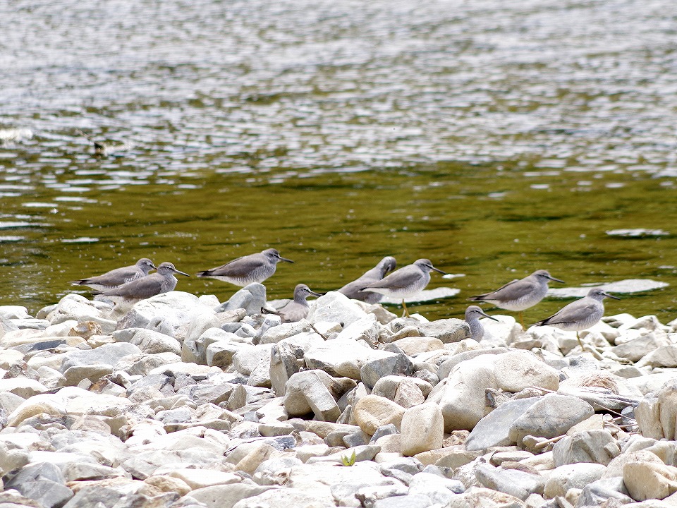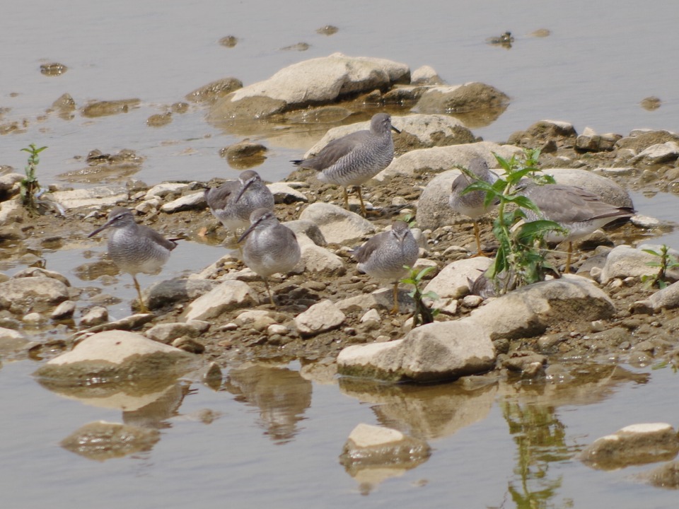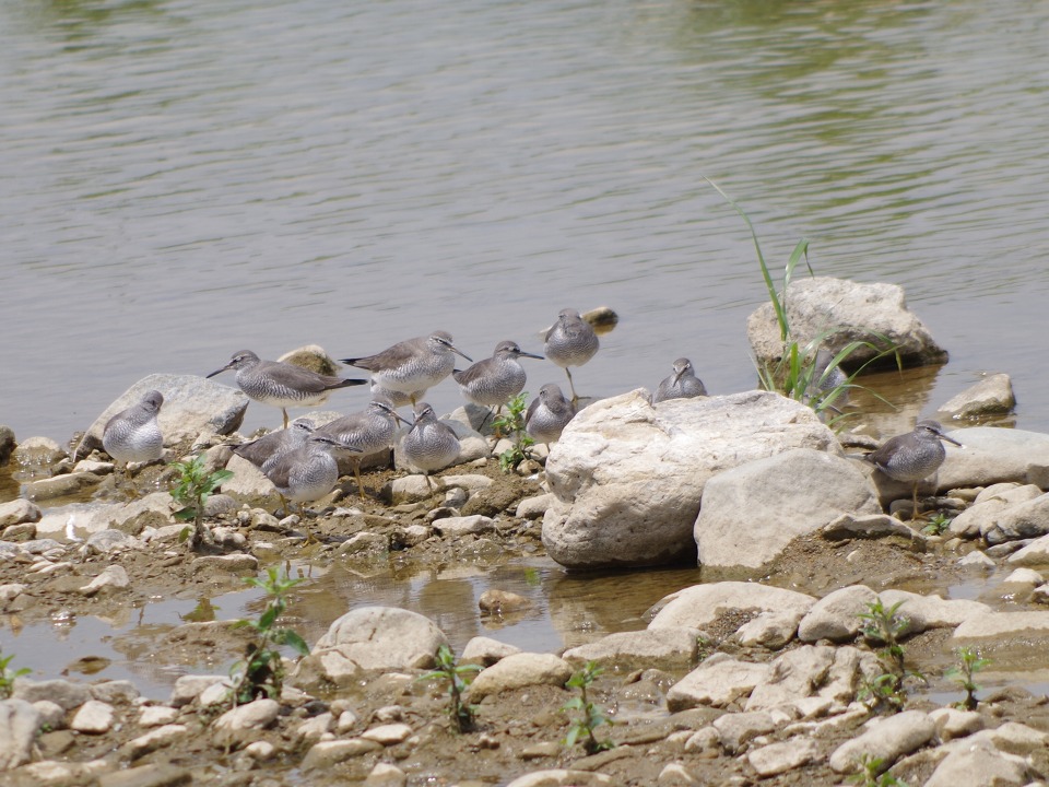 タイトル:北に渡るキアシシギ 観察年月日:2017年5月4日 羽数:9羽 場所:浅川・浅川橋上流 区分:通過 メッシュ:八王子6K コメント:浅川橋上流左岸の水辺にキアシシギ9羽の群がいた。上流に飛び立った。